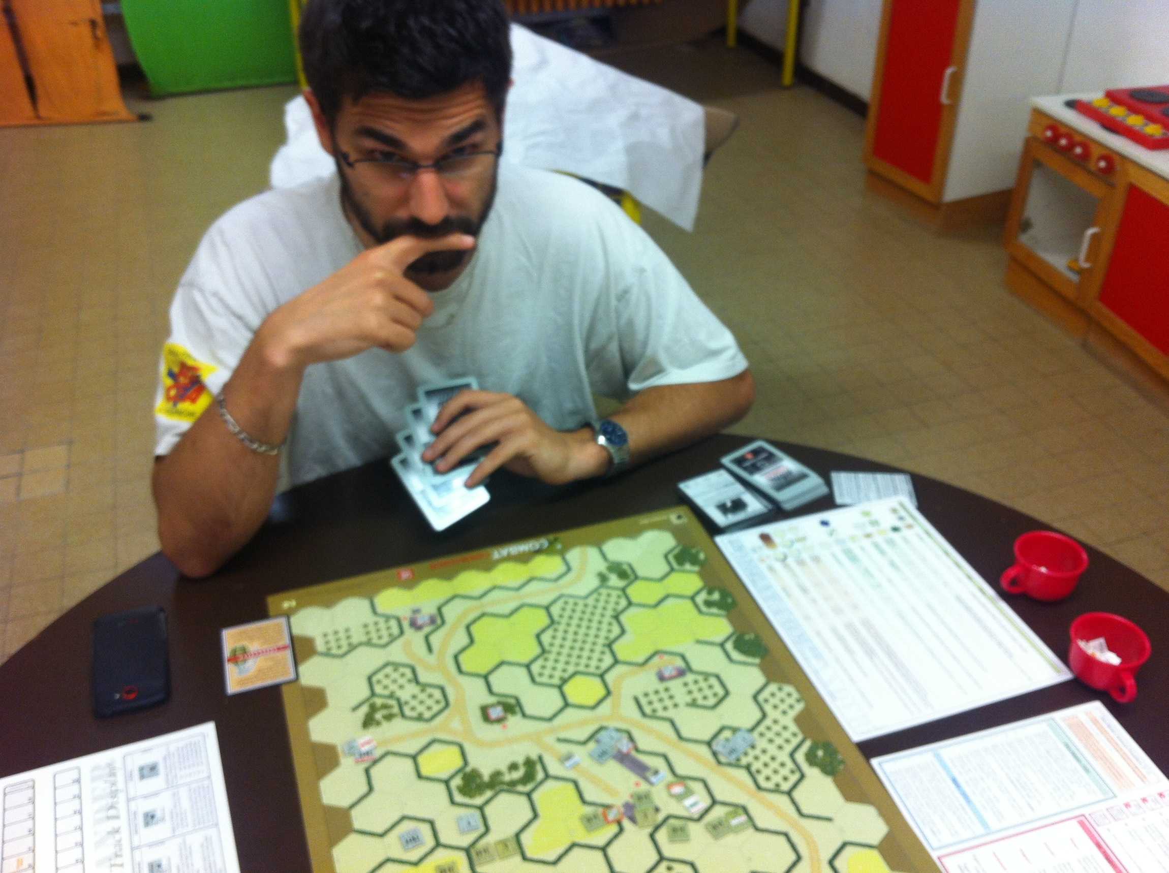 Laurent se rend compte qu'il a mal employé ses unités d'élite. Il a choisi de les grouper (ce qui est un bon choix à mon sens) mais il ne leur a pas accordé l'initiative nécessaire pour balayer la défense allemande. Un autre choix aurait été de mixer les élites et les lignes pour répartir la pression sur deux points différents. Ceci aurait obligé l'allemand à réagir sur deux secteurs (difficile avec seulement 4 cartes, mais jouables avec 4 leaders).