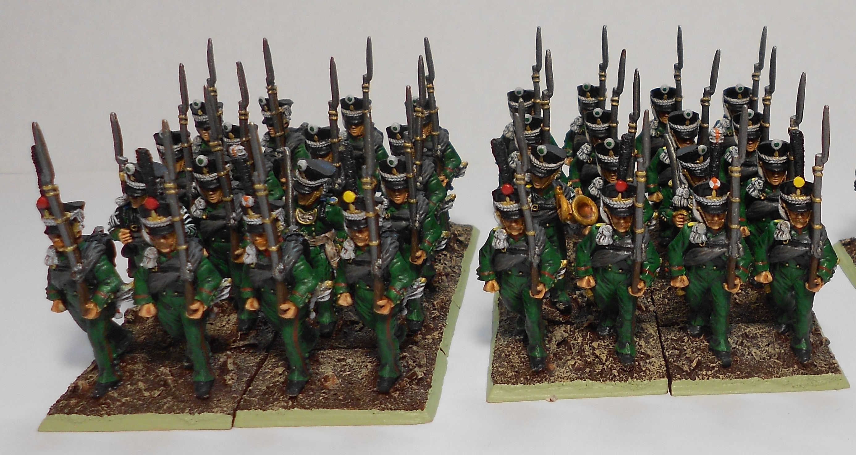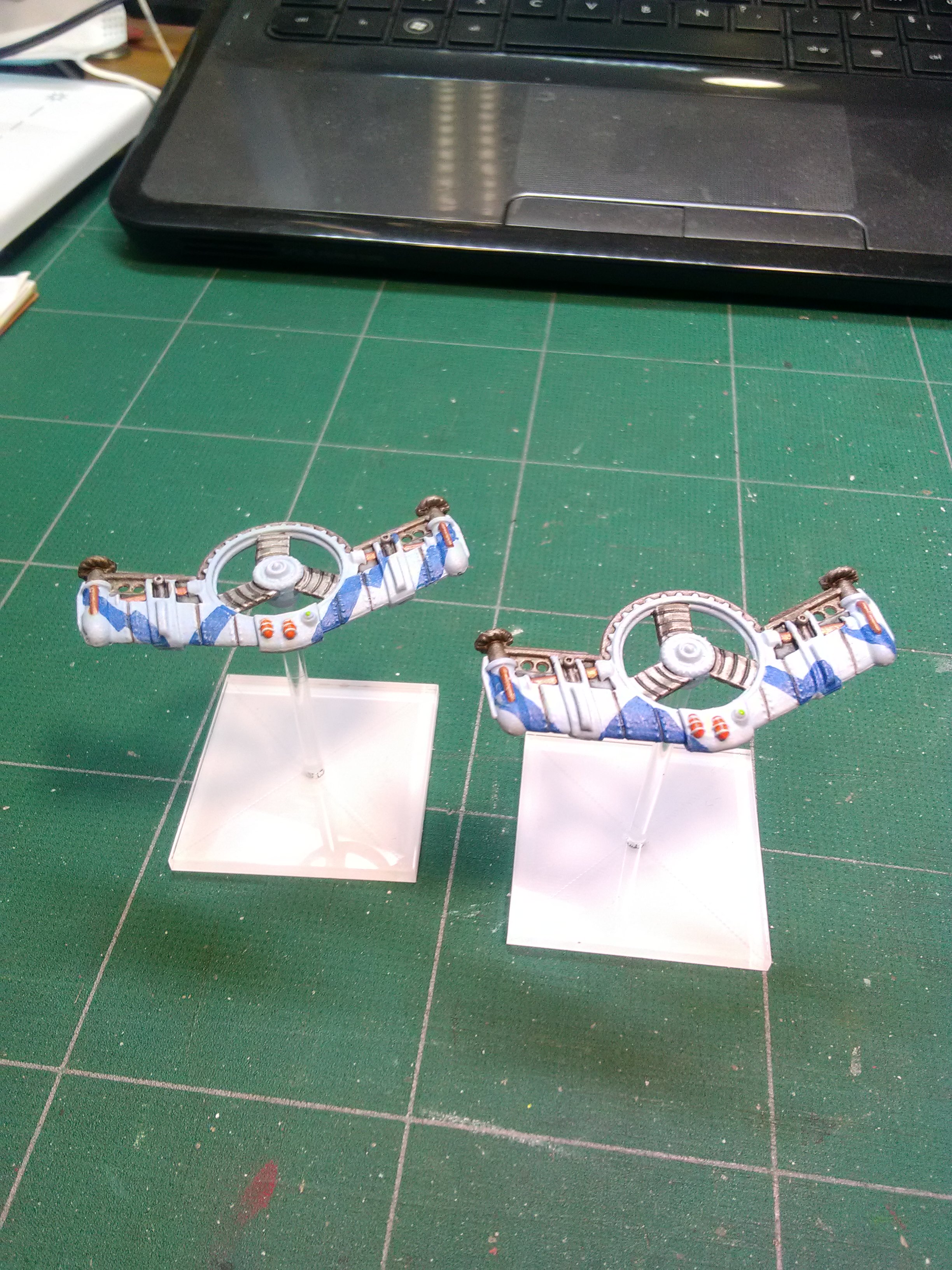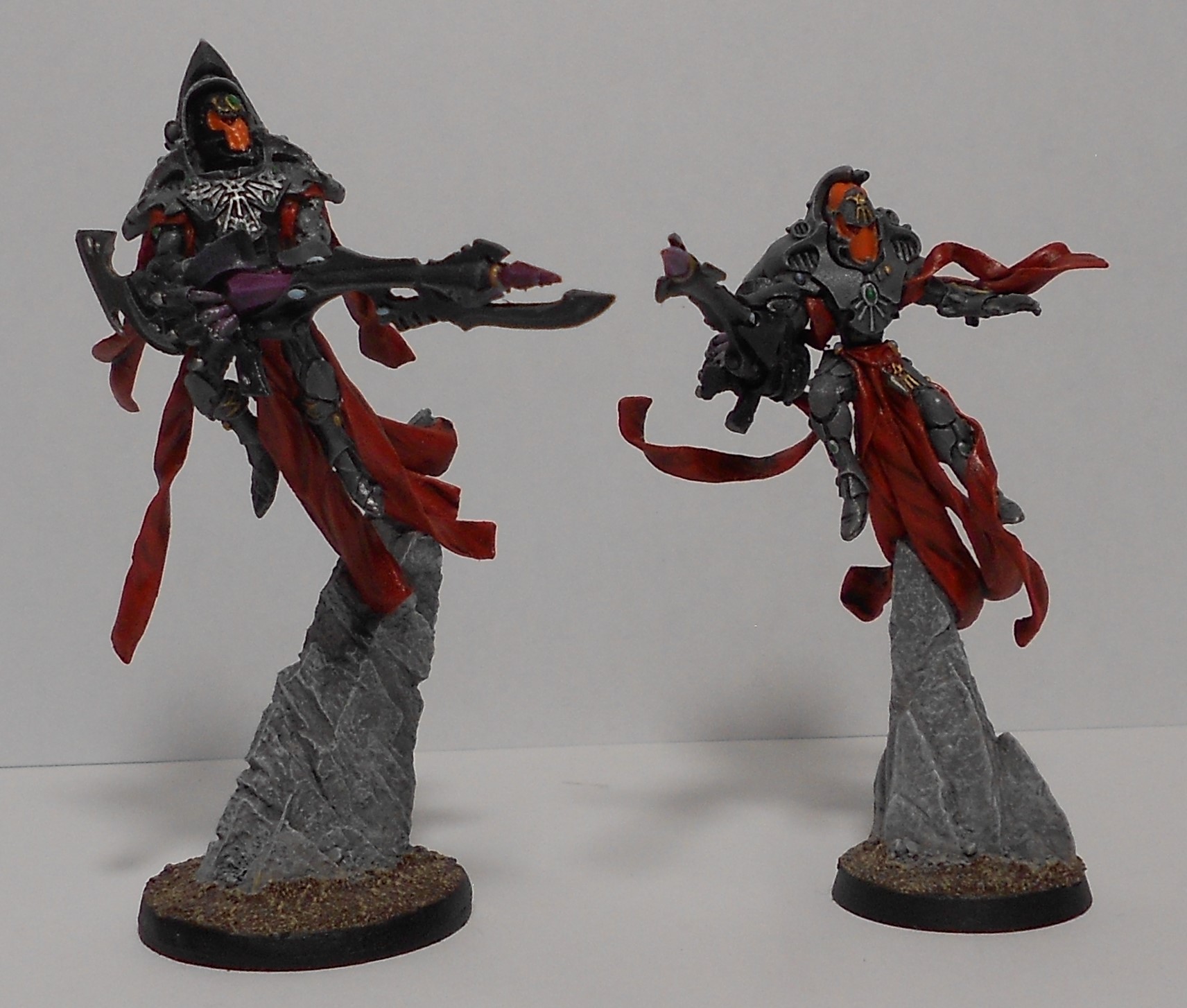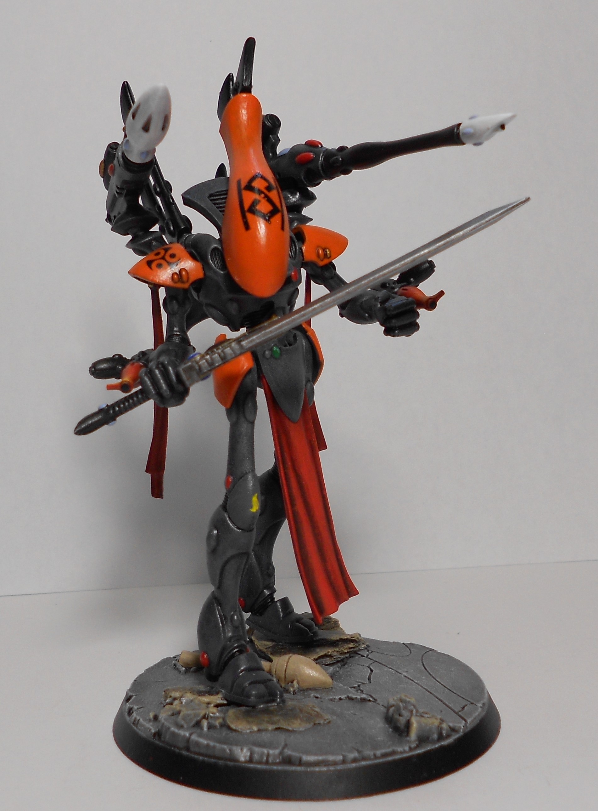 J'aime bien le gris+orange des Eldars et les pierres des socles... Mais ça mériterait pas un petit brossage gris clair sur les arêtes (genre les genouillères) ?