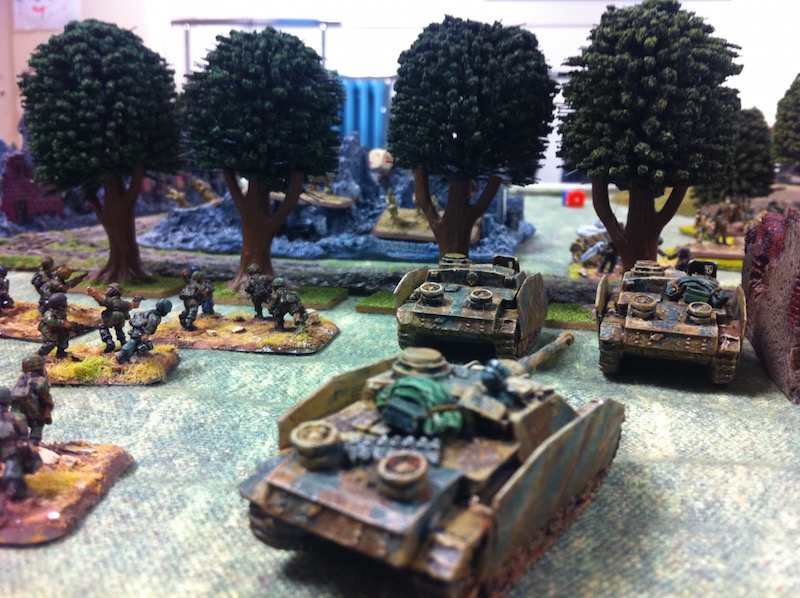 Sur le flan droit, les allemands aidés de STUG arrivèrent en face du village et se calfeutrèrent derrière une rangée d'arbres. S'en suivi un feu nourri toujours aidé de l'aviation et de l'artillerie qui décima la troupe allemande. Les américains décidèrent alors de faire monter des chars pour terminer le boulot. Mais voilà, à leur tour de compter les pertes. Au revoir les chars et bye bye les canons anti-tank ! Merci les PAK 40 !