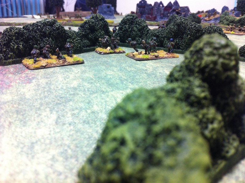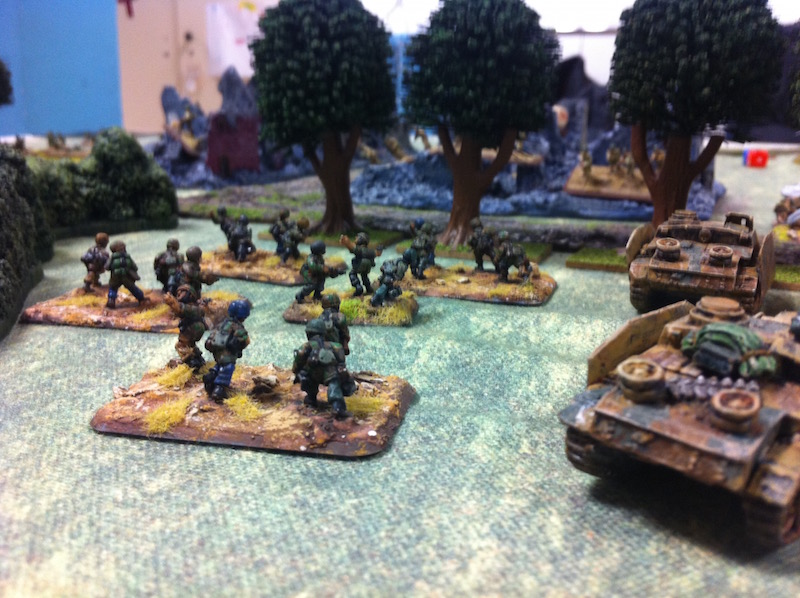 Et que se passait-il de l'autre côté ? Et bien une autre troupe de paras allemands avançait vers un petit bois défendu par les américains. Petit bois placé juste devant l'un des deux objectifs. Mais sur ce côté, l'avancée allemande était plus prudente. Les tirs d'artillerie et de mortiers refroidissant les ardeurs.